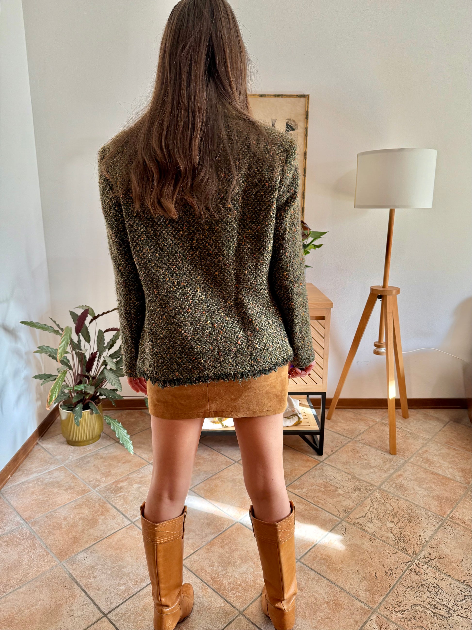 1990's vintage dark green wool blend tweed blazer with orange and yellow specks throughout