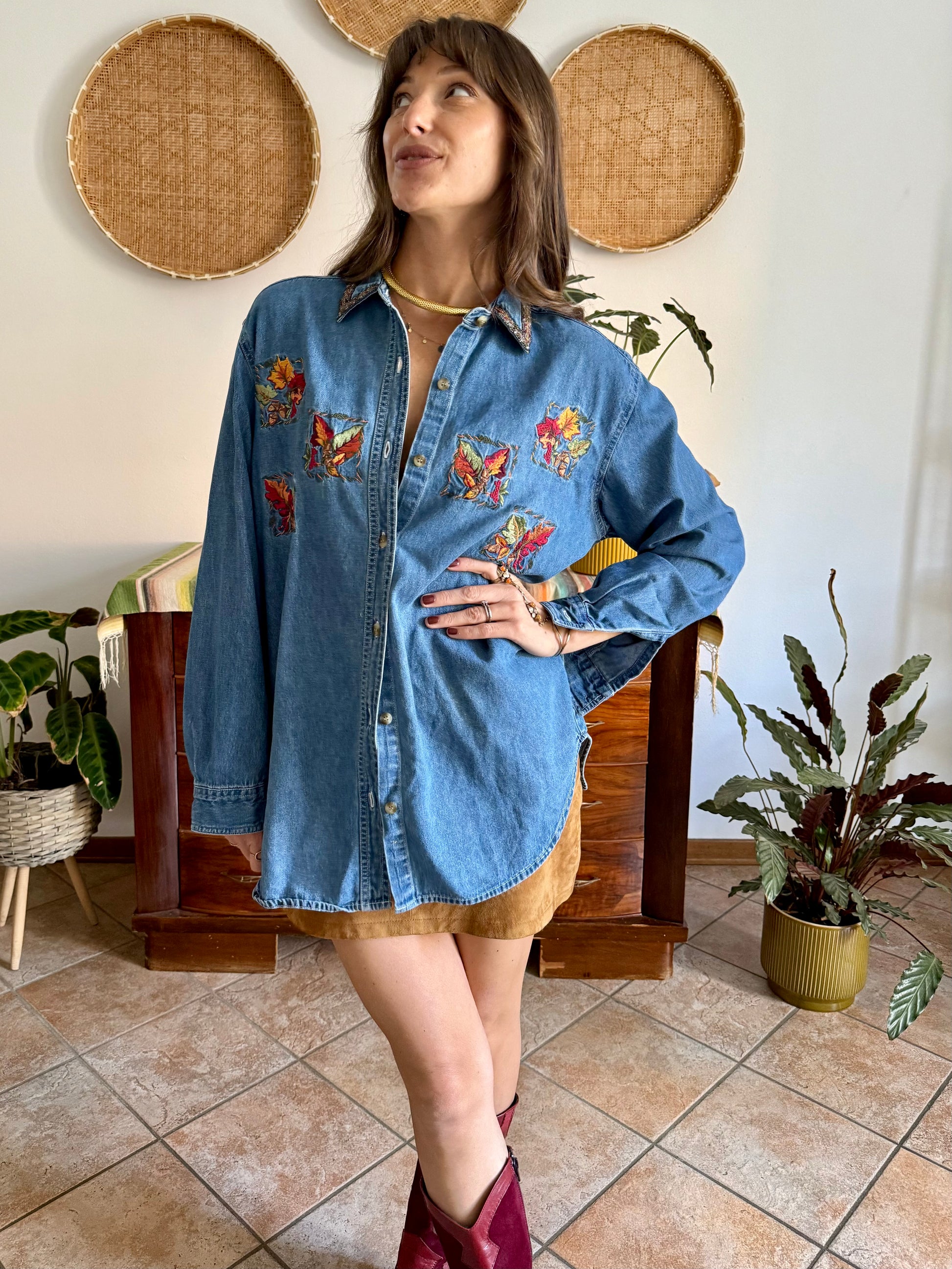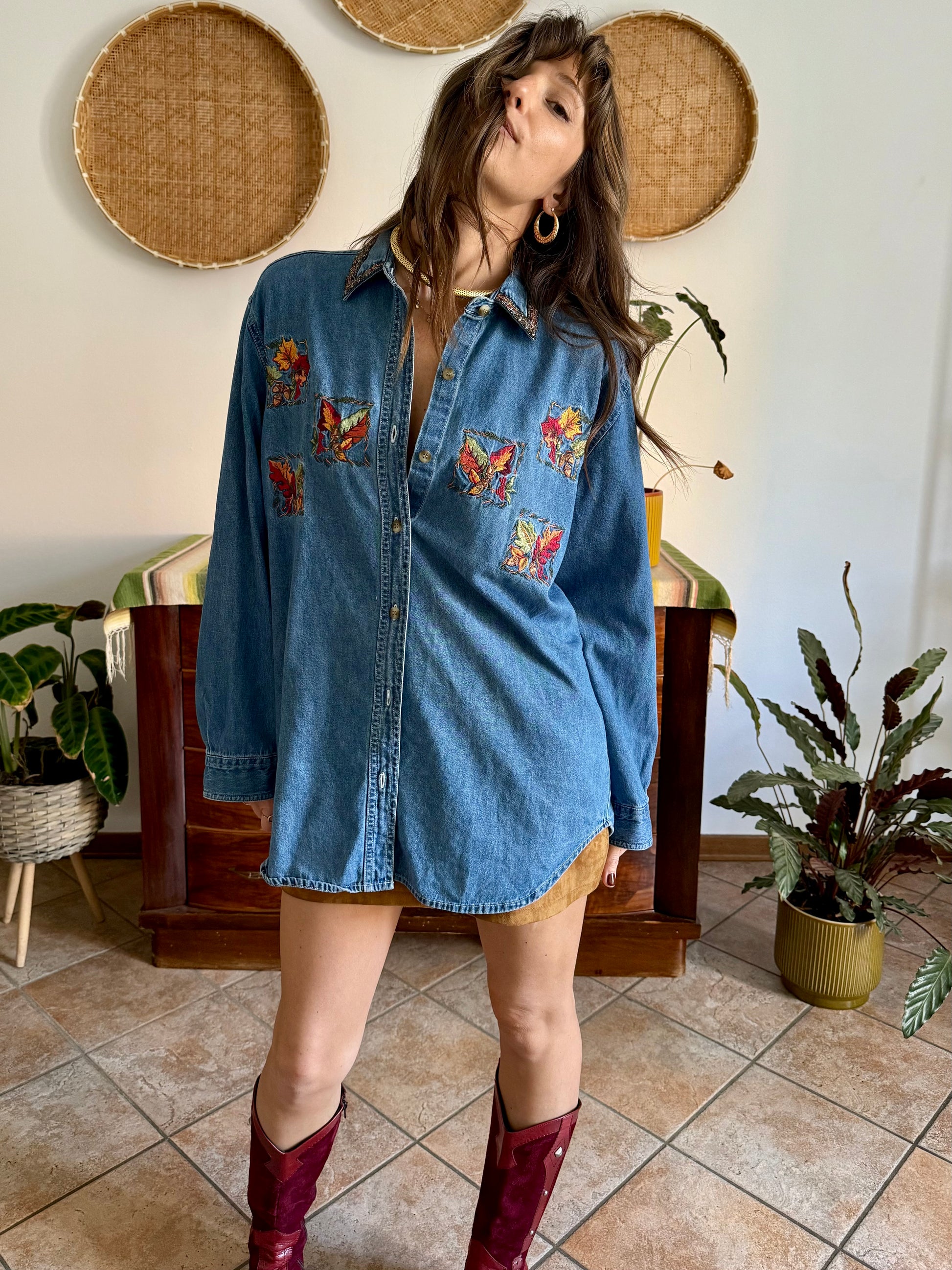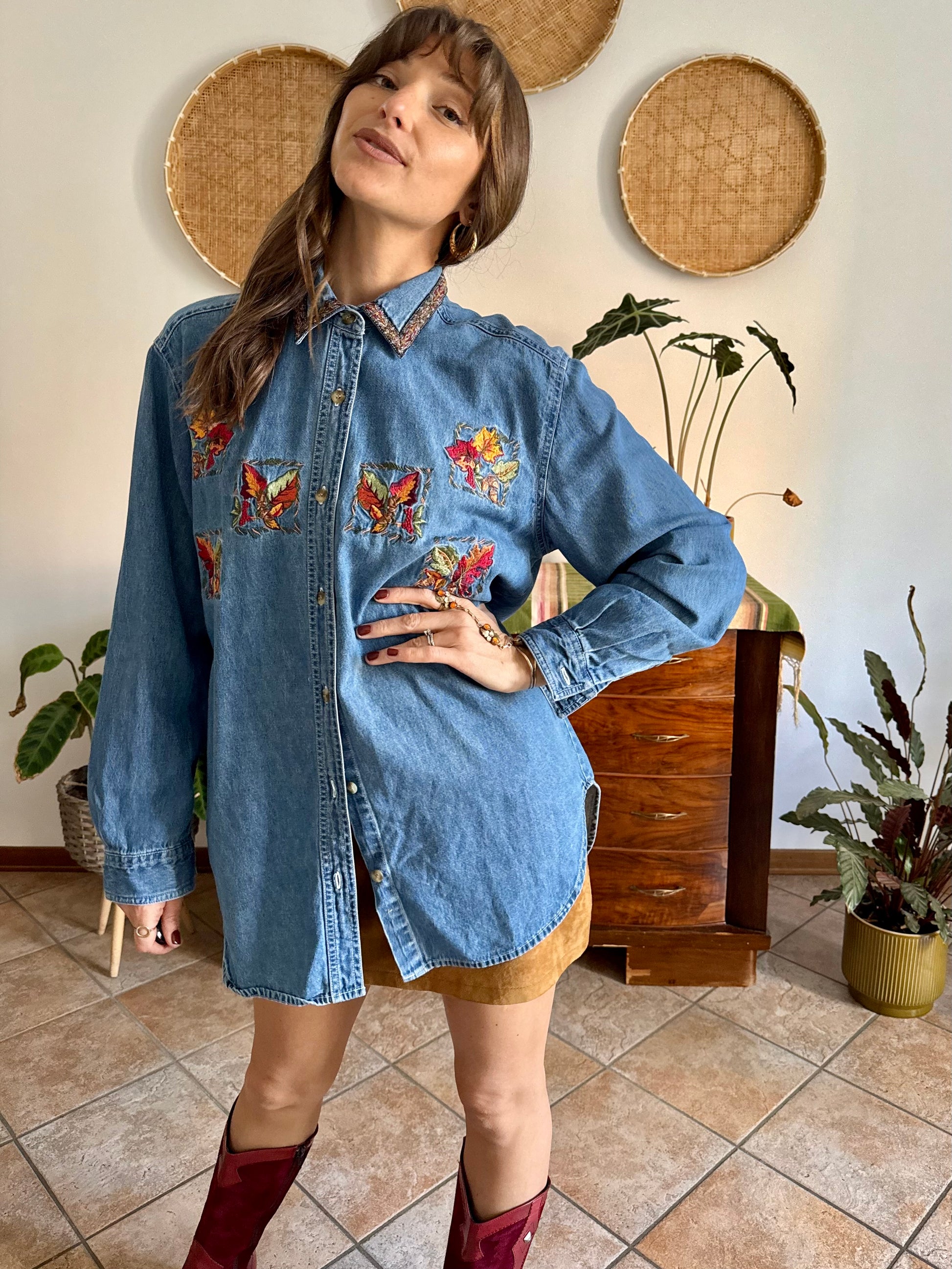 1990's vintage denim shirt with red, yellow and green embroidered autumn leaves