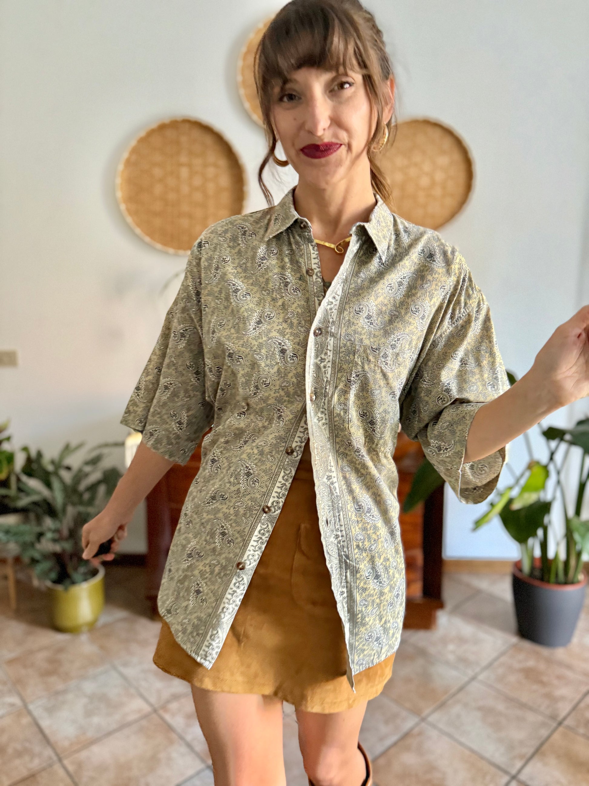 100%cotton. Khaki with cream and navy paisly print. Made in Italy. Translucent faux tortoise shell buttons. Oversize fit. Unisex. Size L (shoulders 54cm, bust 64cm, total length 76cm) all measurements taken flat from seam to seam