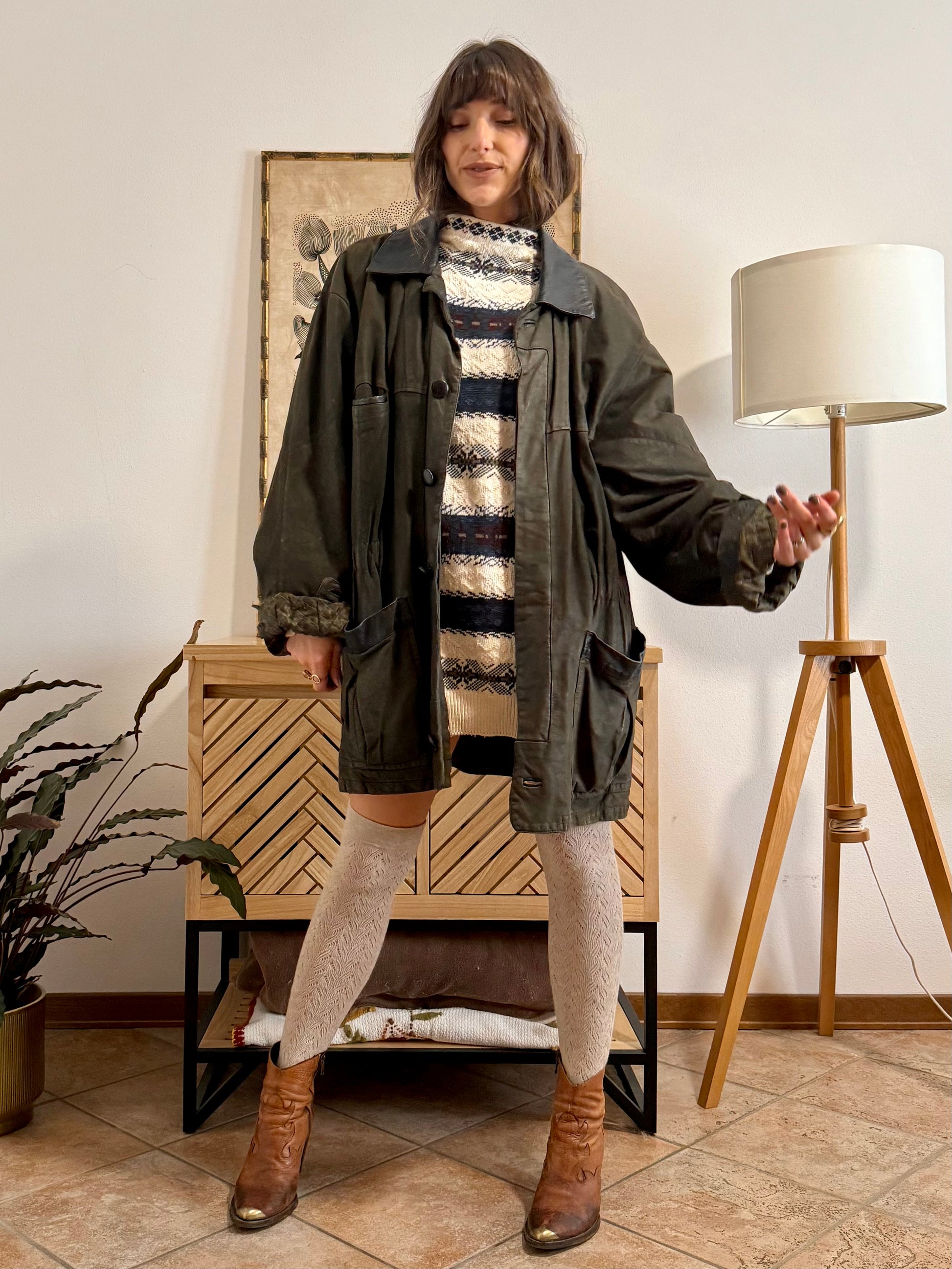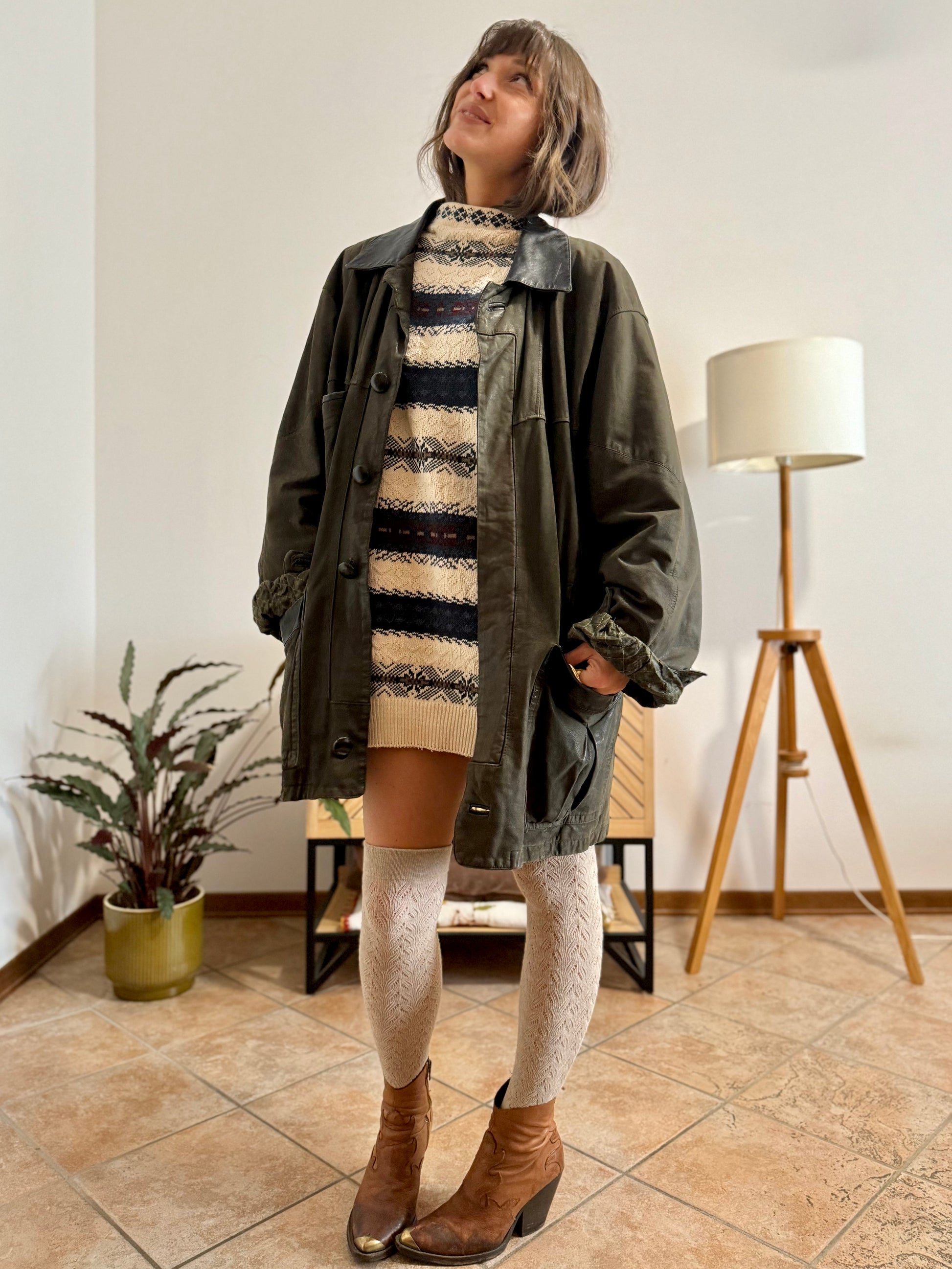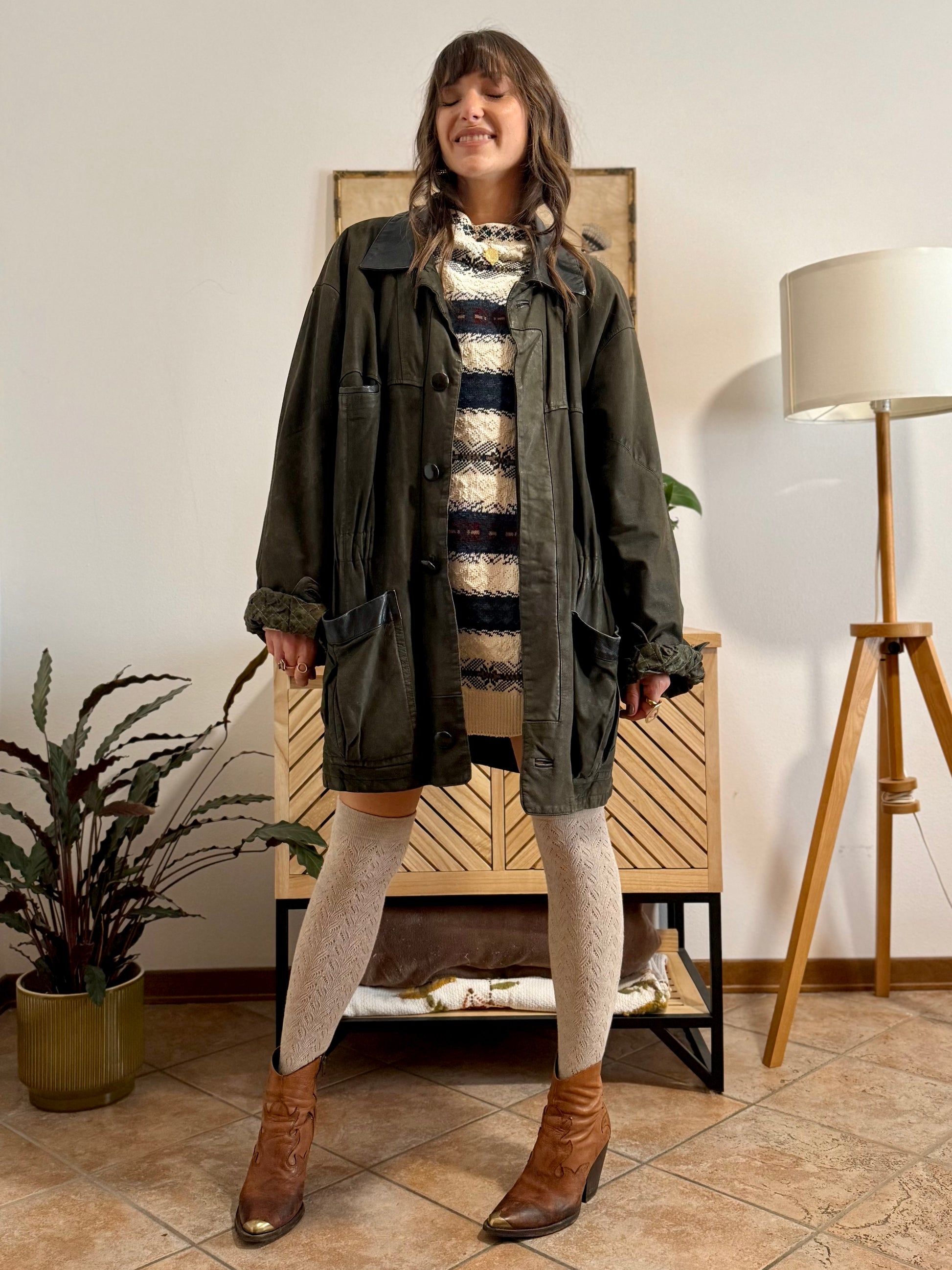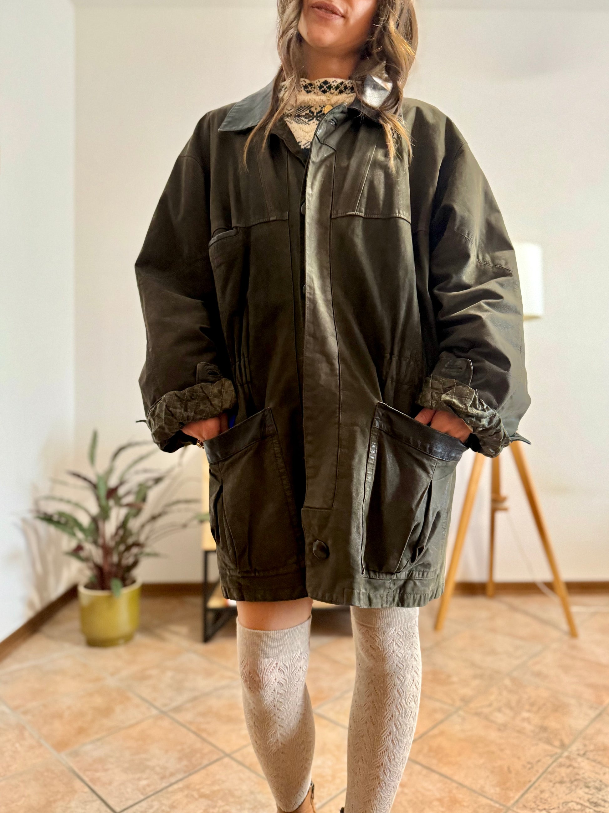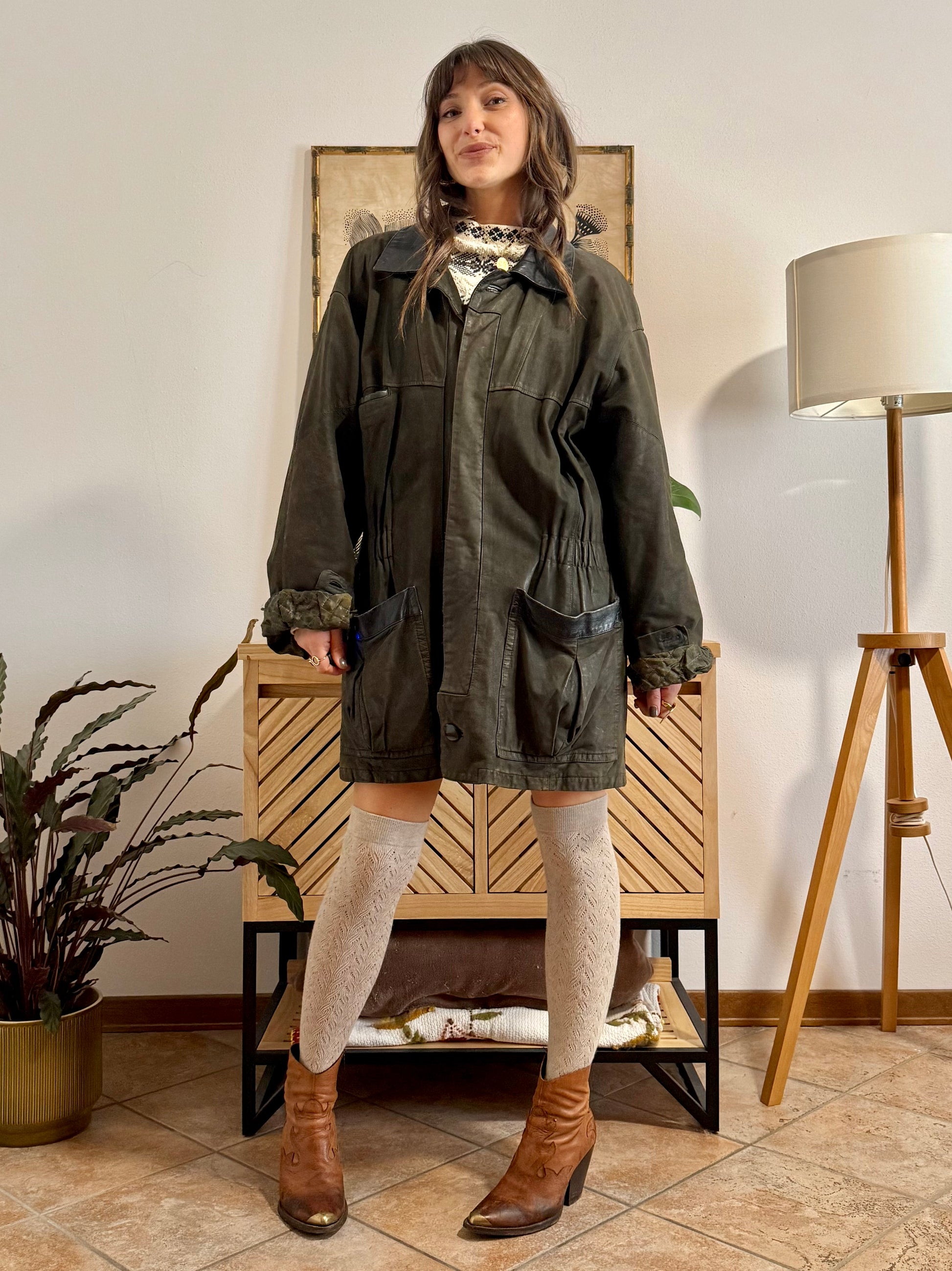 100% genuine leather. Military green leather with black leather collar, button and details. Military green paisley quilted lining. Made in Italy. Size L (shoulders 60cm, bust 66cm, total length 86cm) all measurements taken flat from seam to seam