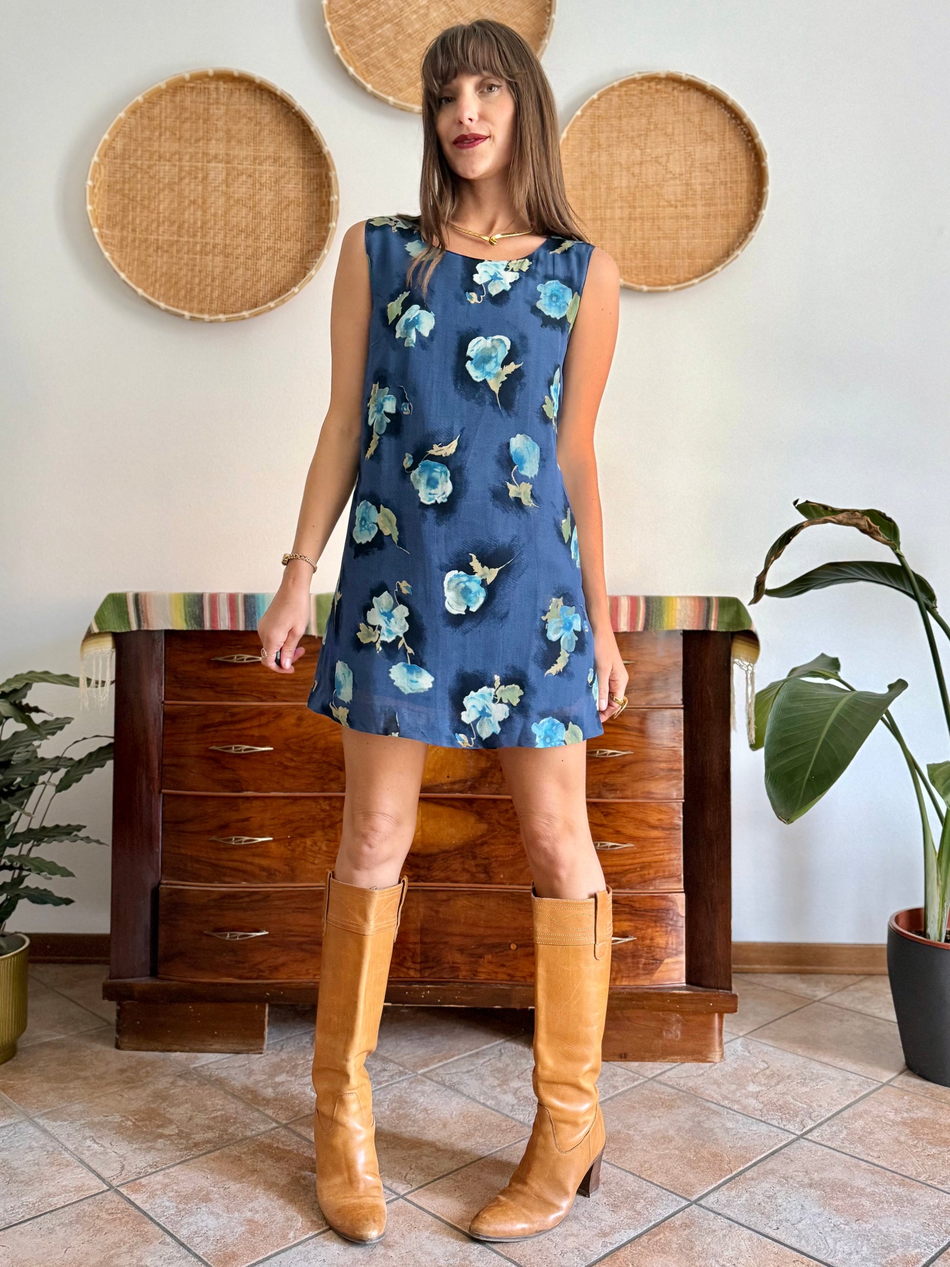 100% viscose. Sheer navy and blue outer layer with light blue, beige, mint and turquoise floral print. Navy blue lining. Size M (shoulders 36cm, bust 43cm, waist 44cm, hips 48cm, total length 80cm) all measurements taken flat from seam to seam