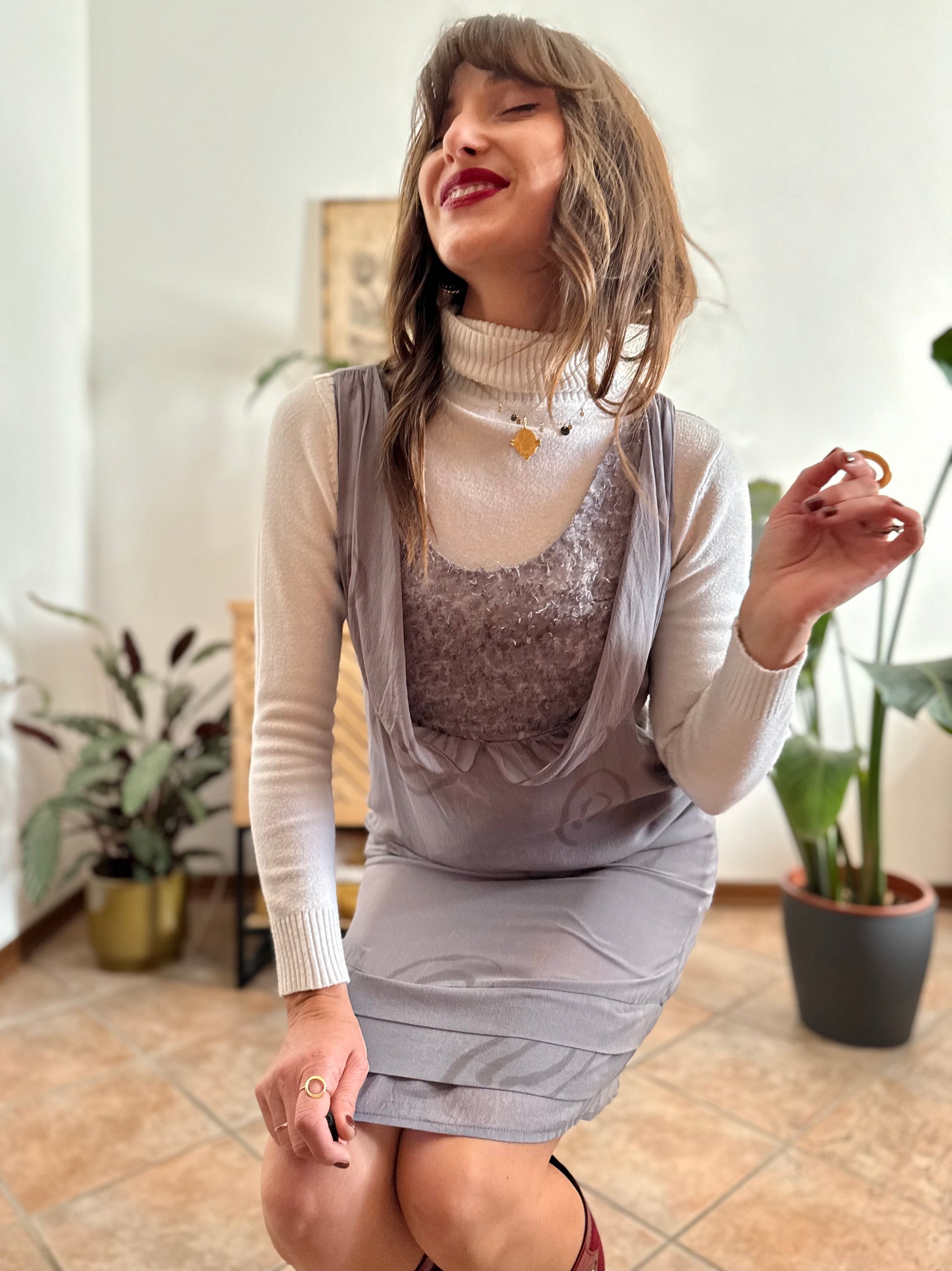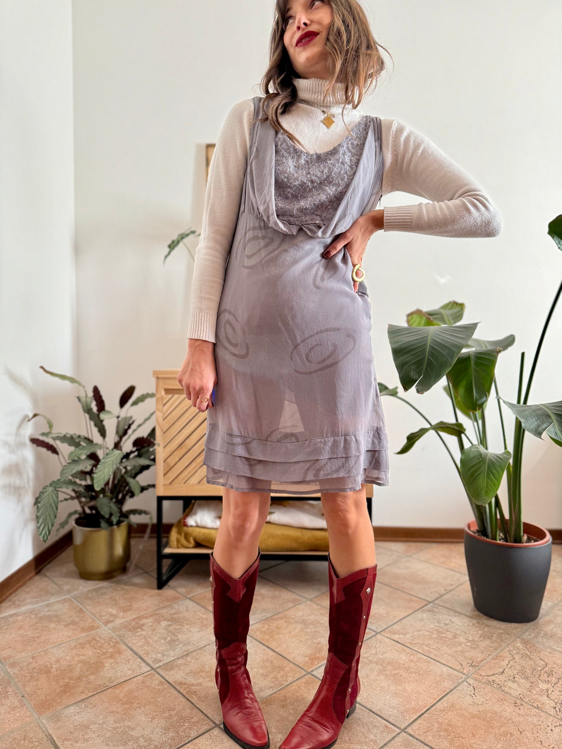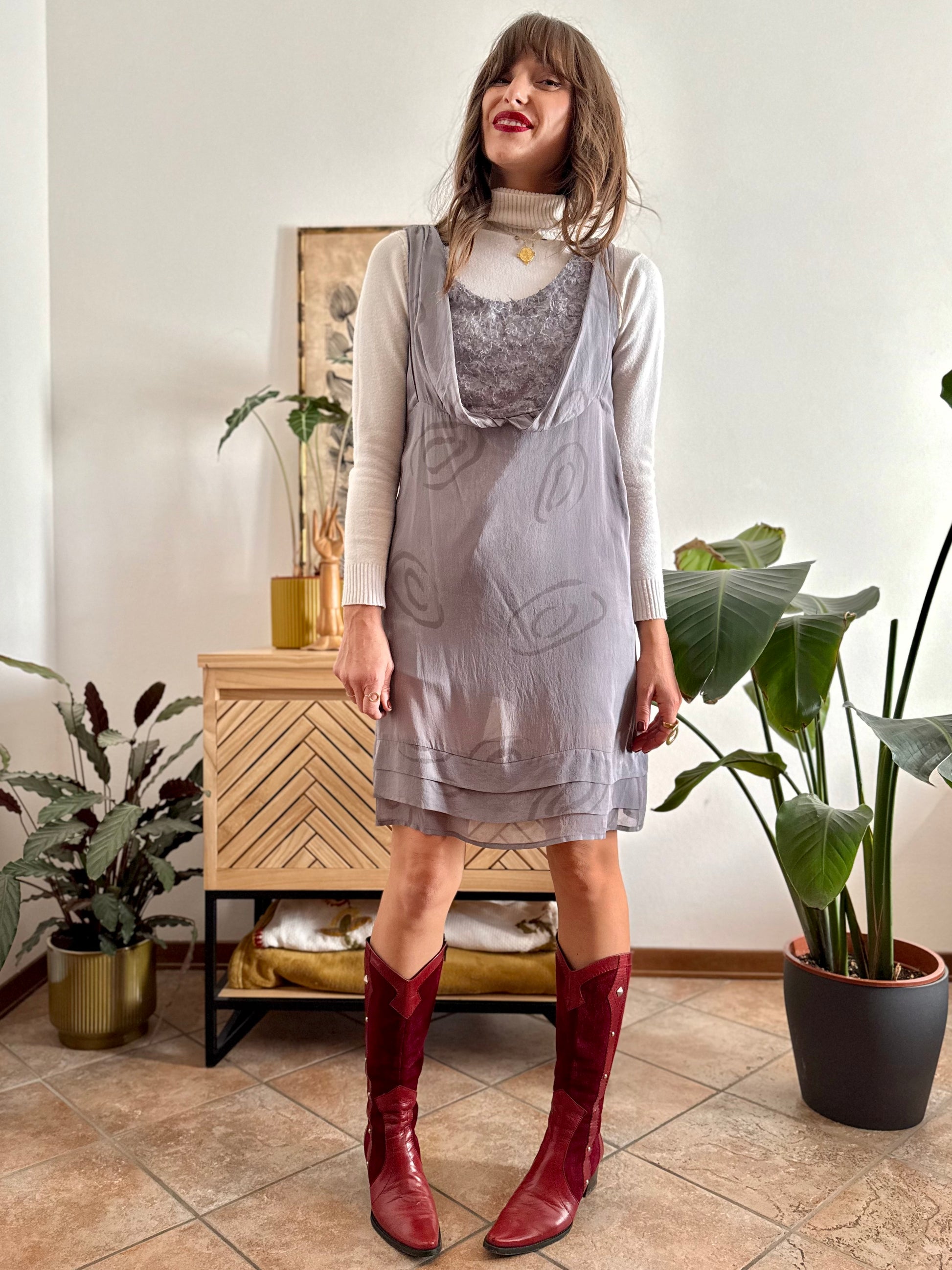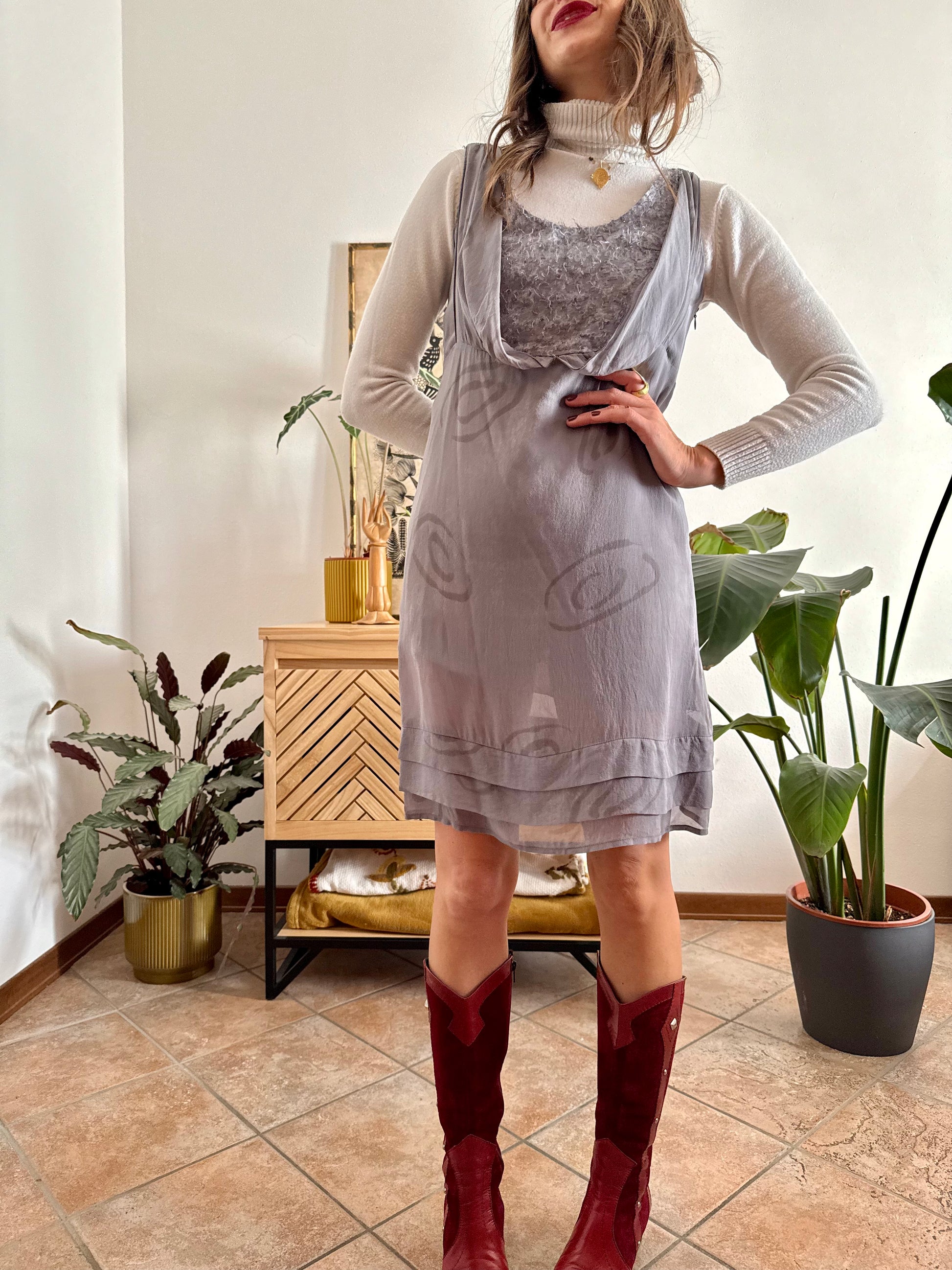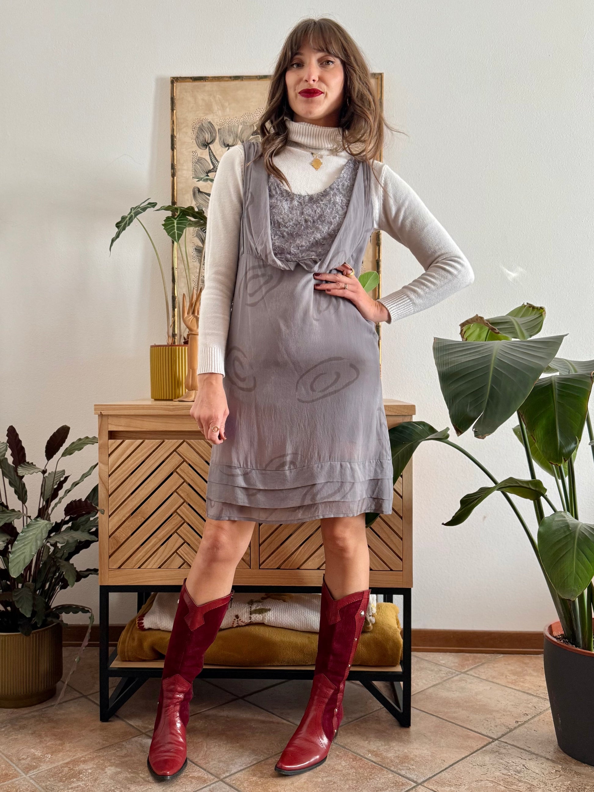 100% silk. Light grey sheer silk with darker grey scroll print. Silver and grey texture tinsle effect on bust. Sheer grey silk lining. Cowl neck. Made in Italy. Size M (shoulders 36cm, bust 46cm, waist 42cm, hips 50cm, total length 89cm) all measurements taken flat from seam to seam