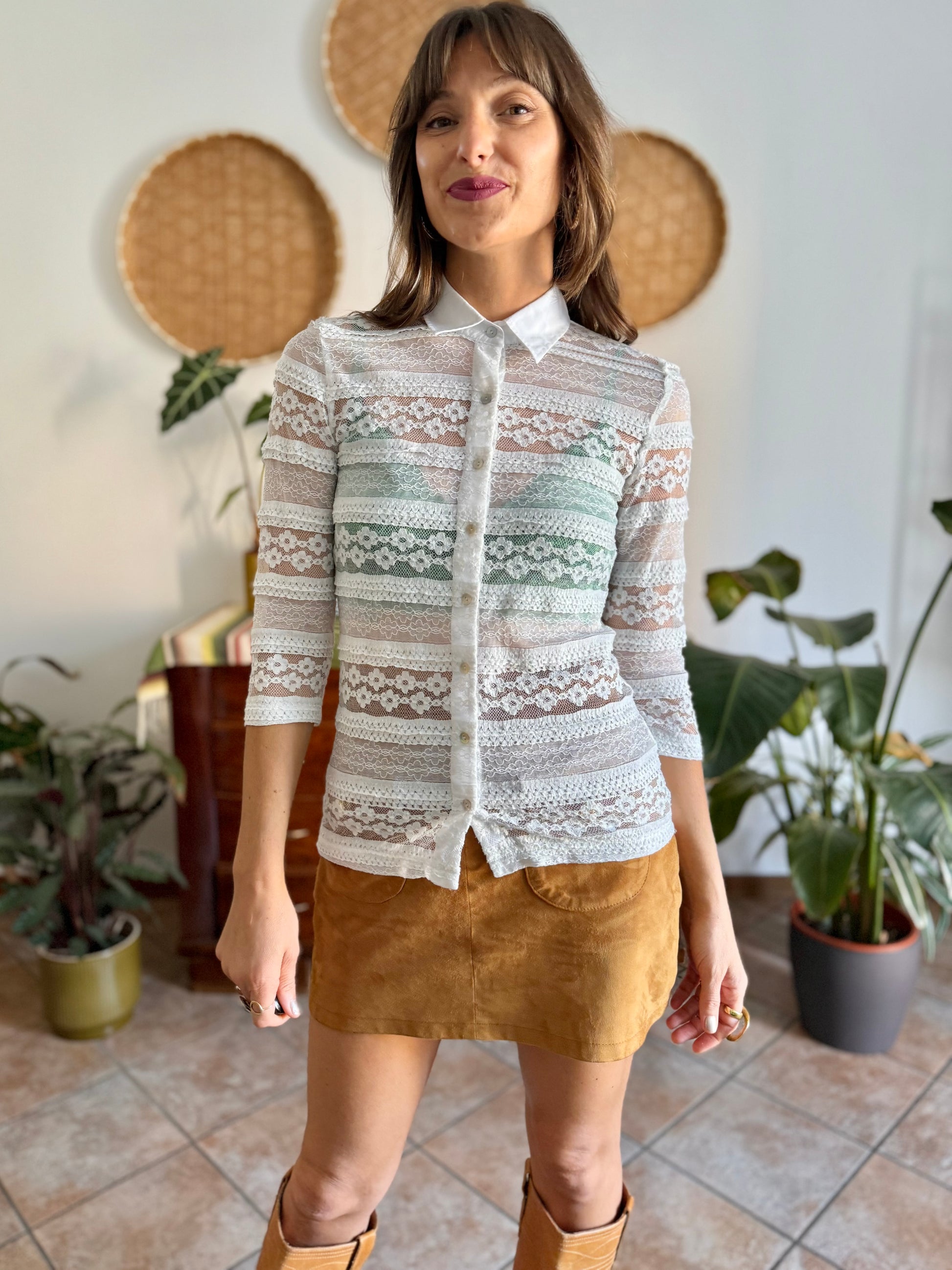 92% polyester 8% elastane. White textured floral lace with white cotton collar. Cream mother of pearl buttons. Size S (shoulders 40cm, bust 46cm, total length 62cm) all measurements taken flat from seam to seam