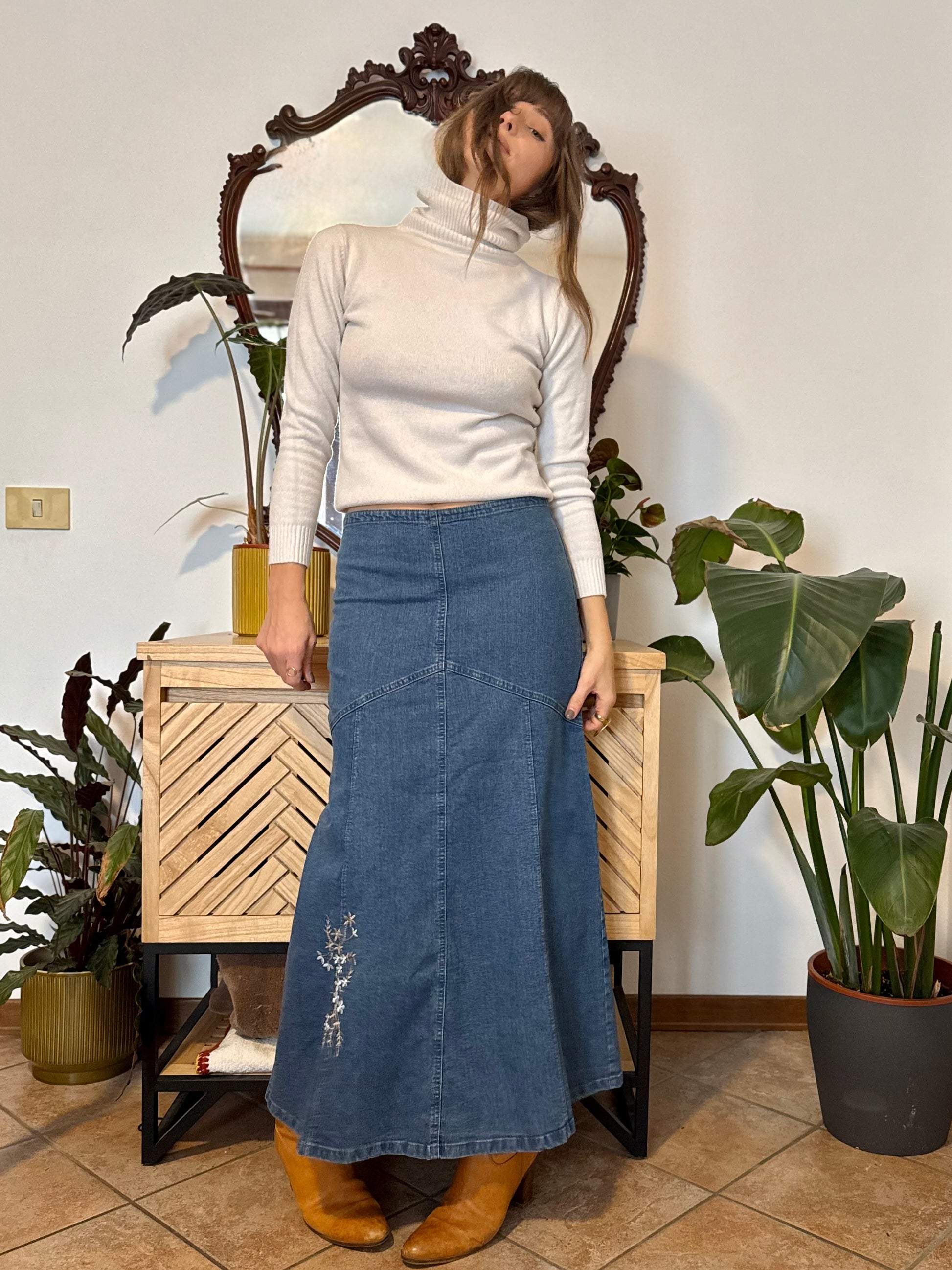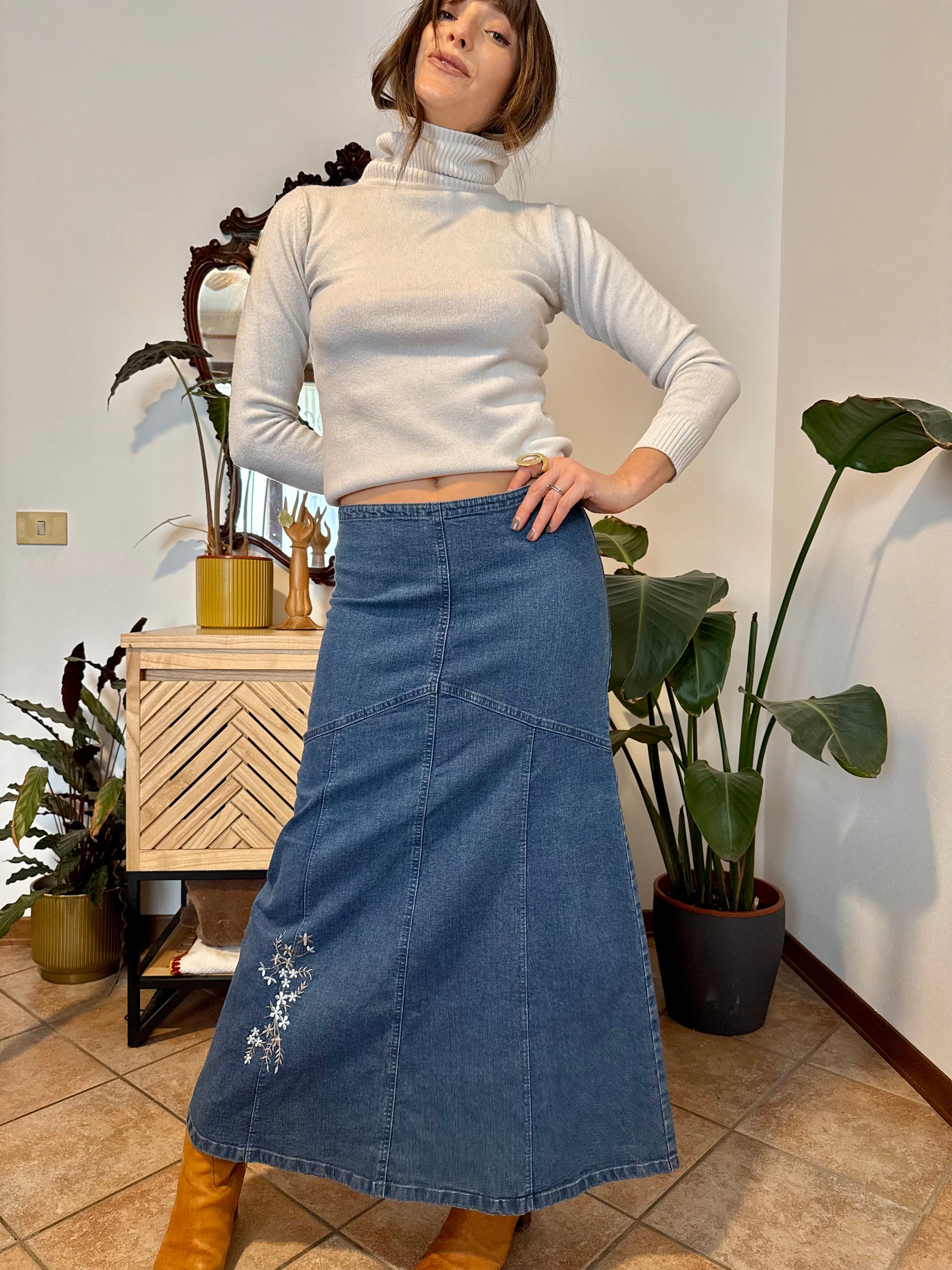 Y2k vintage denim maxi skirt with embroidered floral details