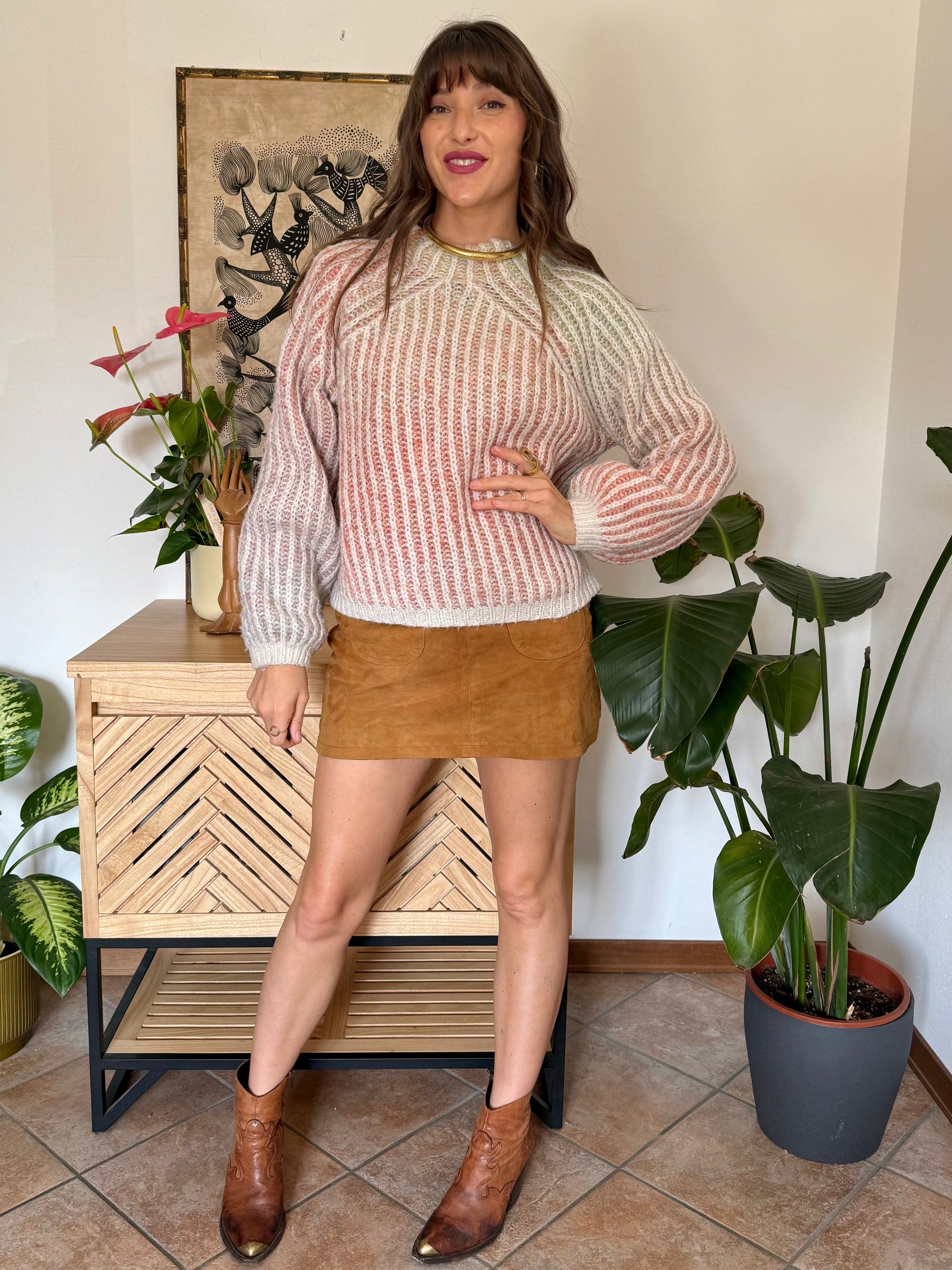 38% polyester recycled 36% polyester 23% acrylic 3% wool. Cream, light pink, orange yellow and green knit. Size L.