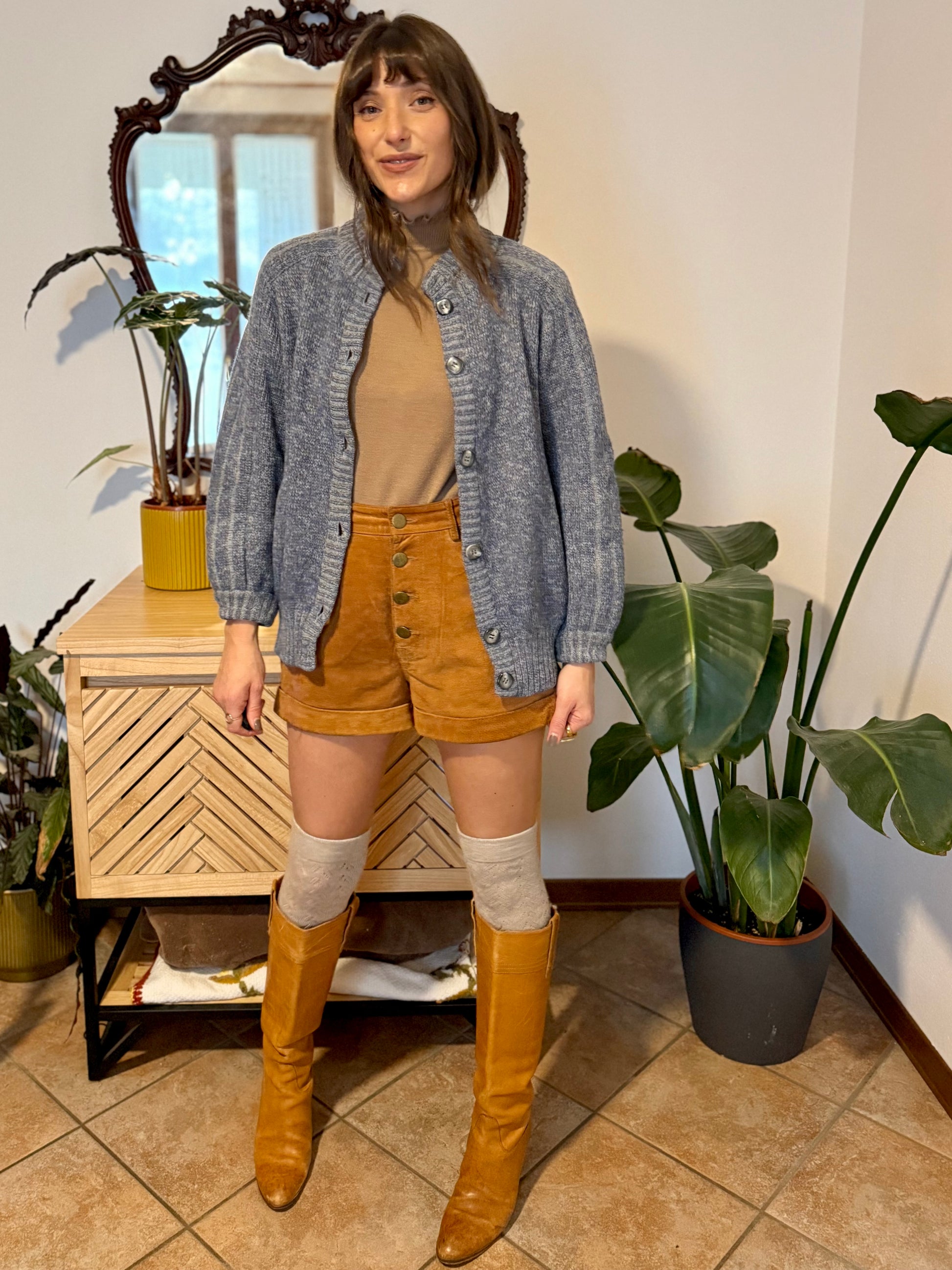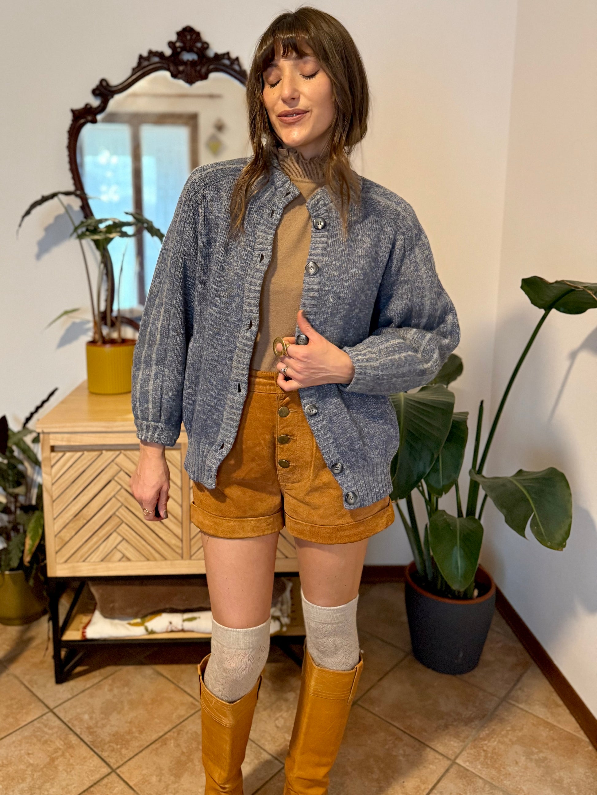 49% wool 23% mohair 12% nylon 2% acrylic. Thick blue and beige heathered knit. Button down. Two pockets. Made in Italy. Size L (shoulders 44cm, bust 64cm, total length 61cm) all measurements taken flat from seam to seam