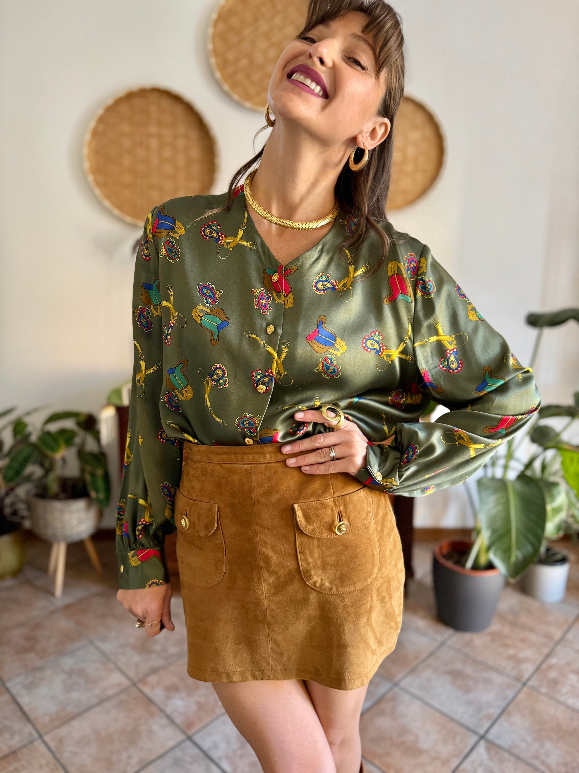 1970’s vintage green silk blouse with multicolor equestrian \print