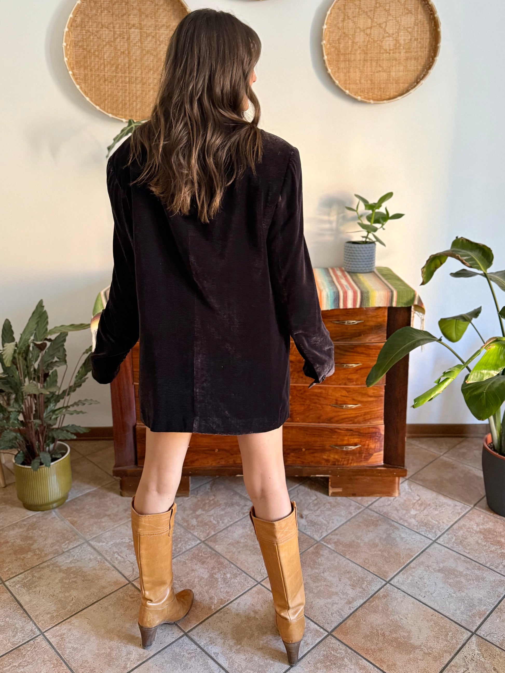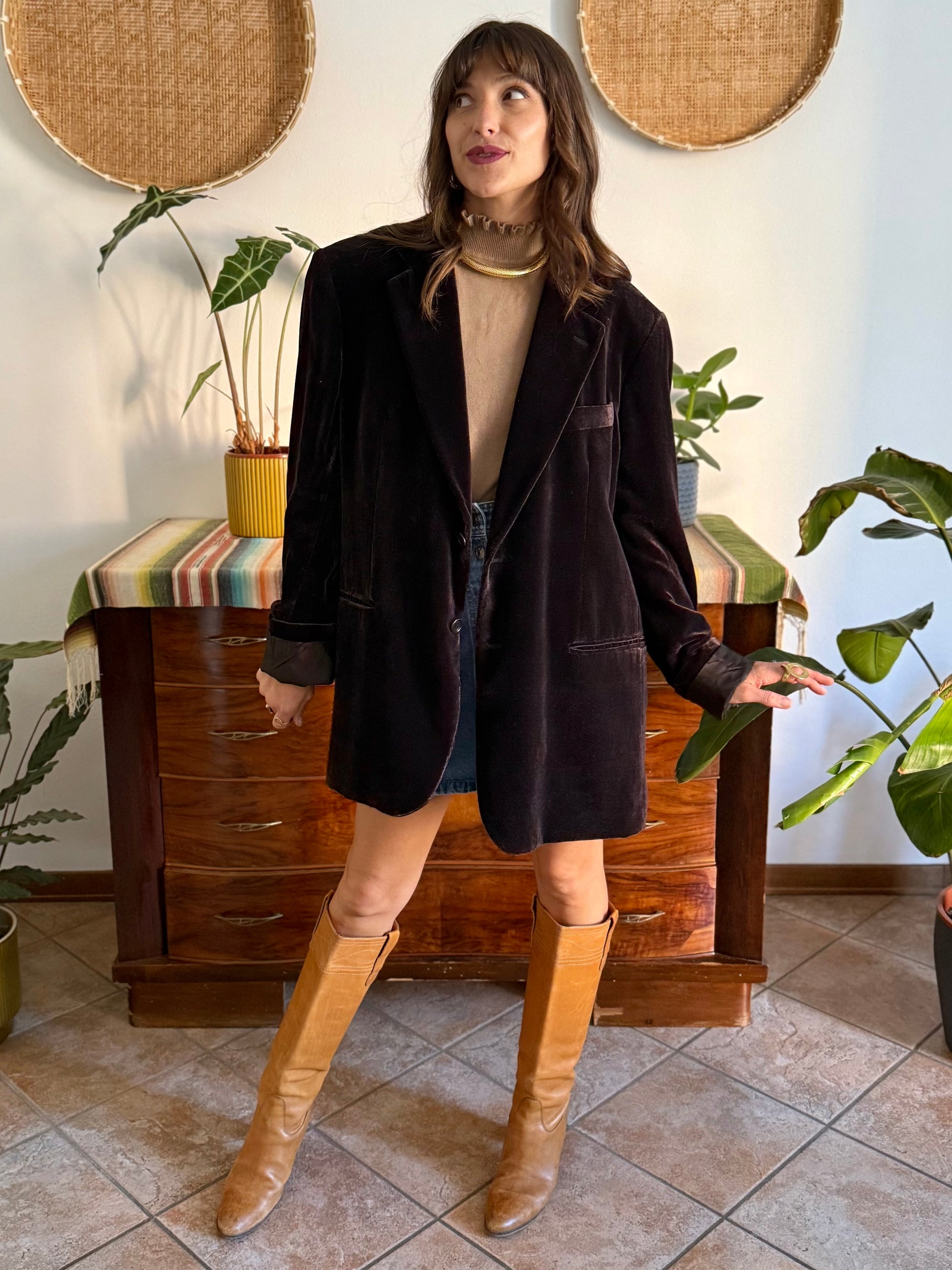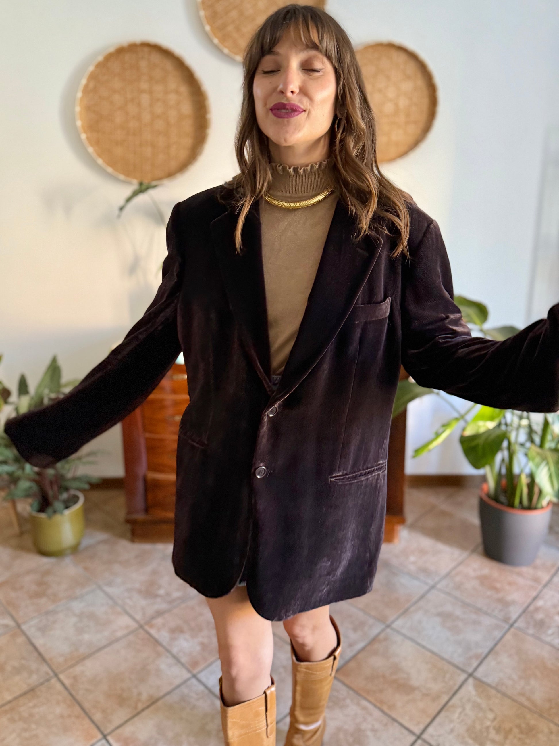 15% silk 75% viscose 10% nylon. Dark brown with a mauvy tint textured velvet with dark purple satin lining. Made in Italy. Size XL (shoulders 50cm, bust 60cm, total length 82cm) all measurements taken flat from seam to seam