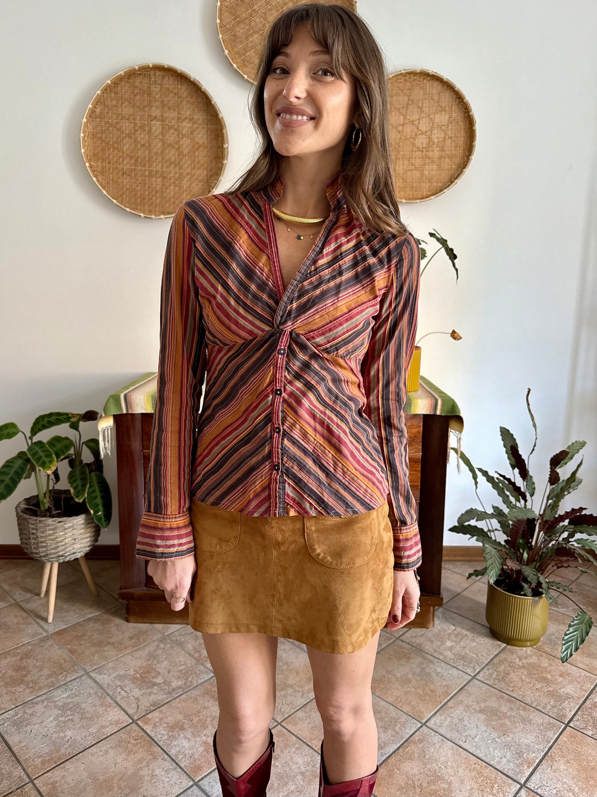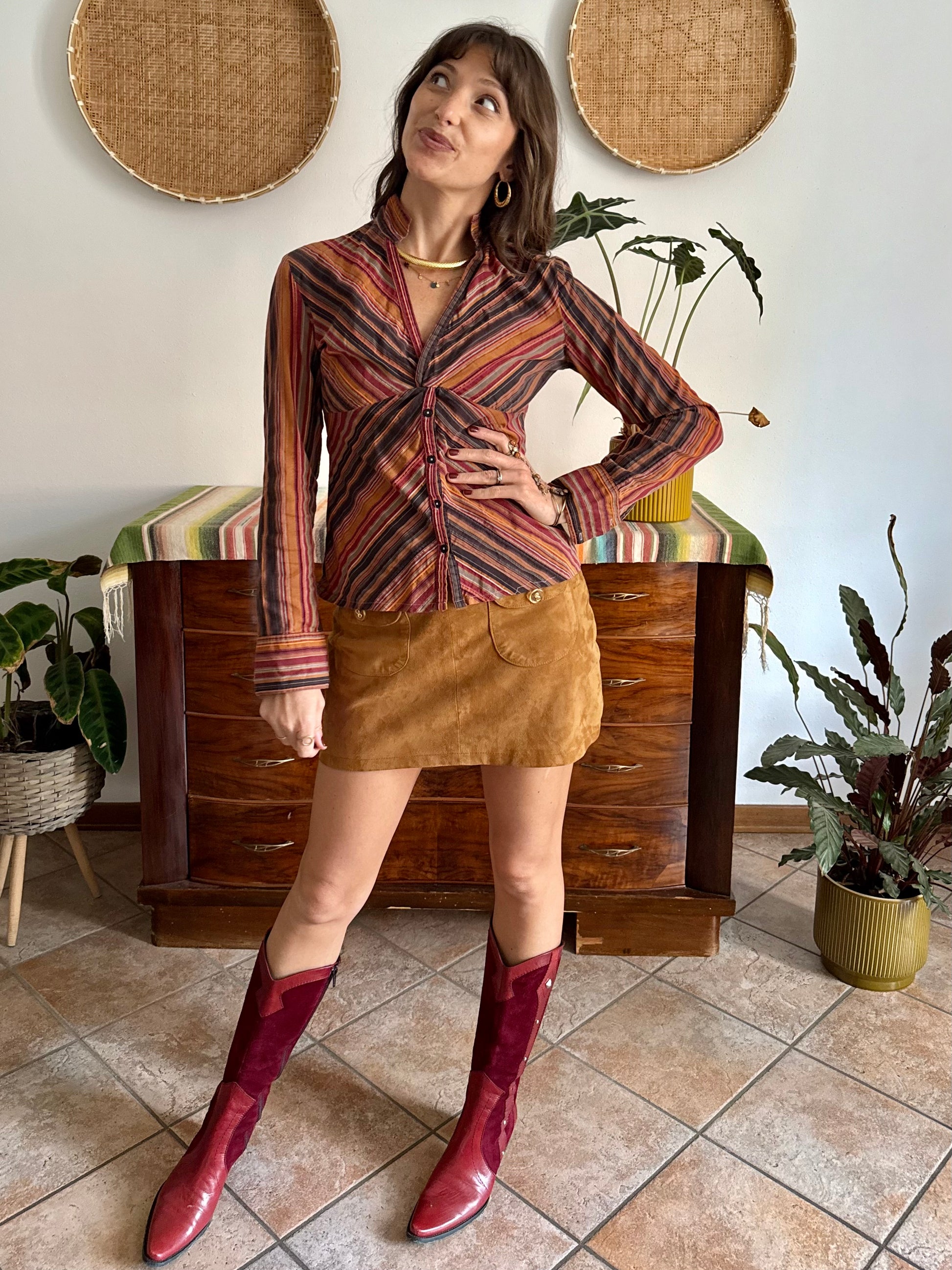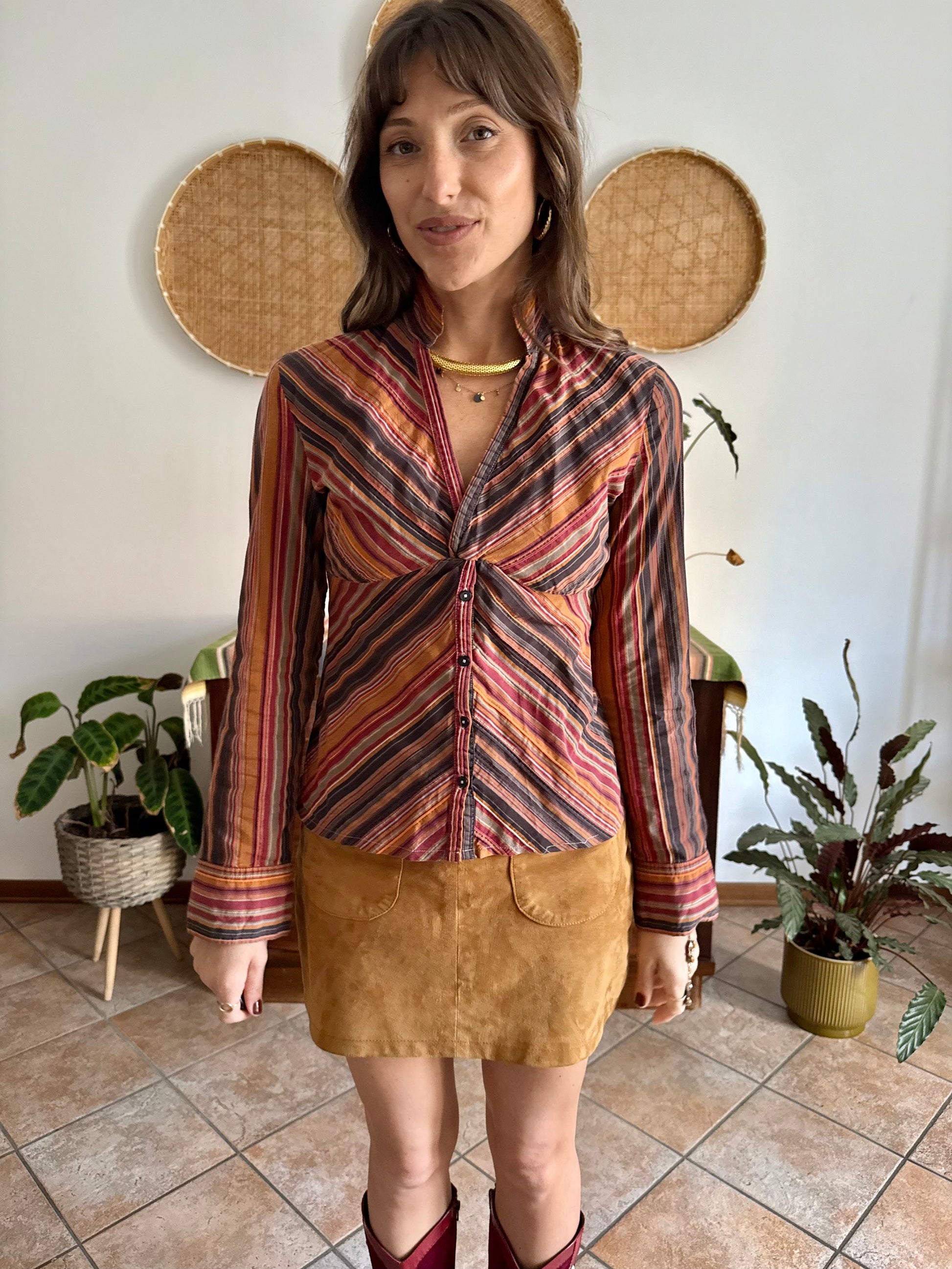 100% cotton. Burgundy, chocolate brown, orange and grey vertical stripes. Button detail along bottom. Size M (shoulders 44cm, bust 50cm, total length 59cm) all measurements taken flat from seam to seam